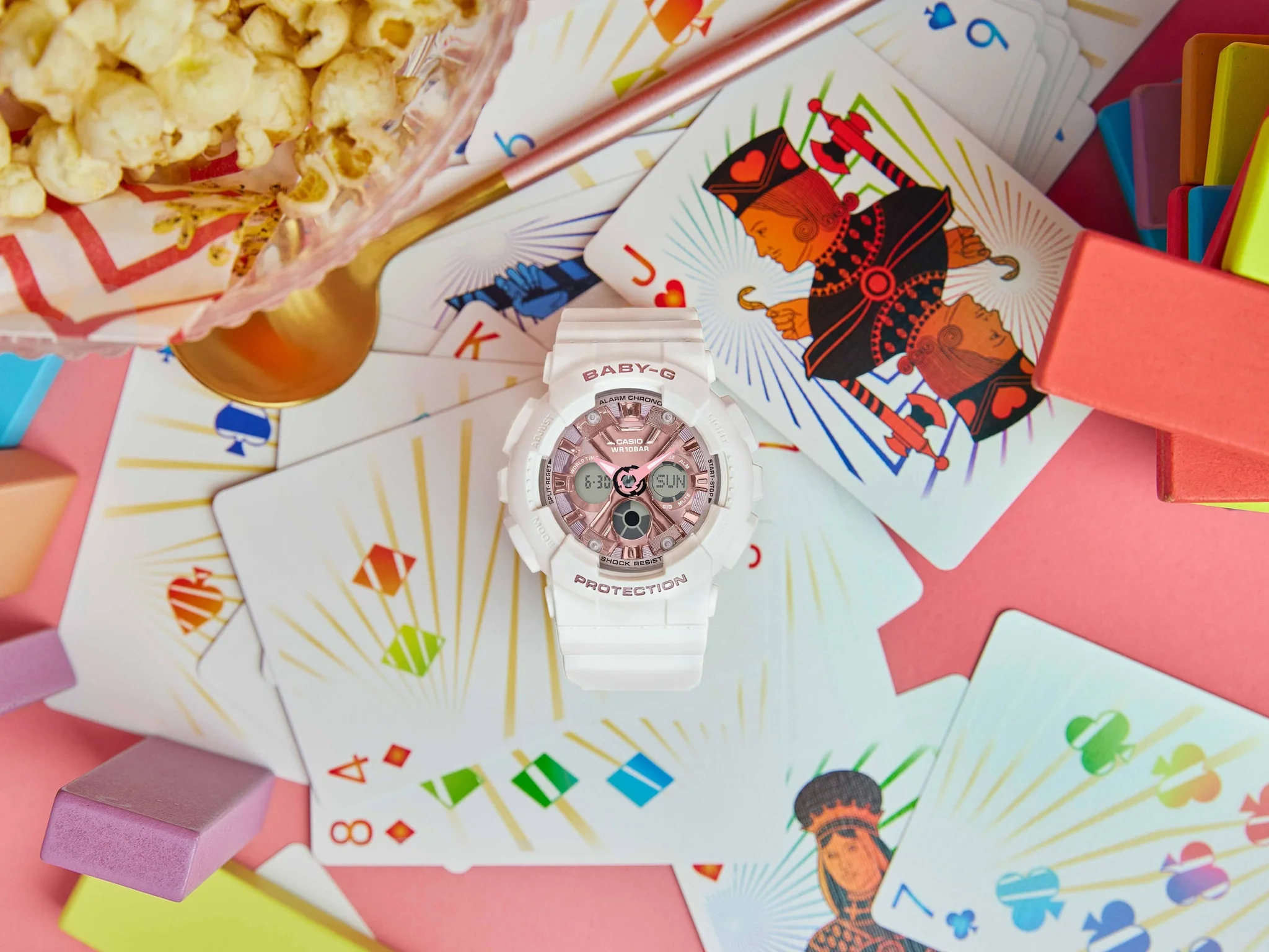 The Casio Baby-G BA-130-7A1DR combines a bold analog-digital display with a clean white case and touches of pink for a fresh street-style look. Metallic dial accents add depth and shine, while the matte resin construction keeps the watch lightweight and easy to wear.