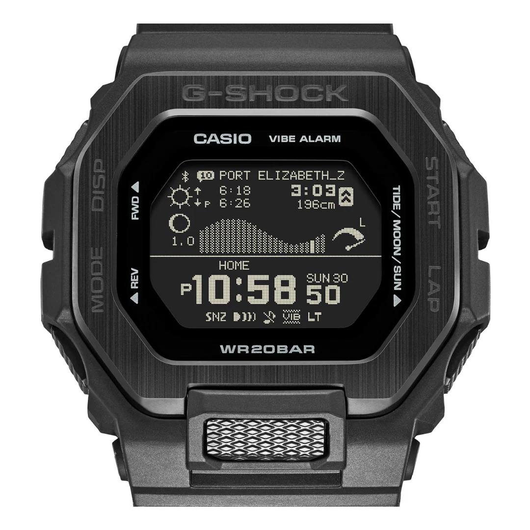 Ride the waves with the Casio G-Shock GBX-100NS-1DR, part of the extreme-sports G-LIDE series designed for surfers. Inspired by night surfing, this digital G-SHOCK combines durability, smart functionality, and style with a black ion-plated bezel and a sleek resin band.