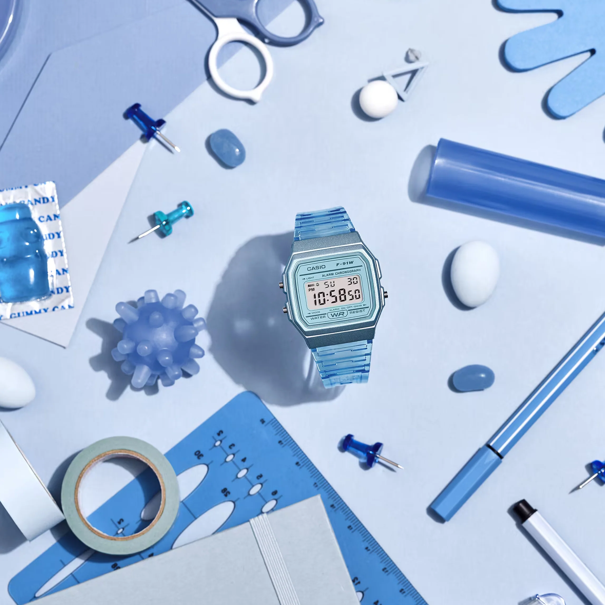 Experience retro icon meets translucent blue style with the Casio F-91WS-2DF, a digital watch built for casual everyday wear.