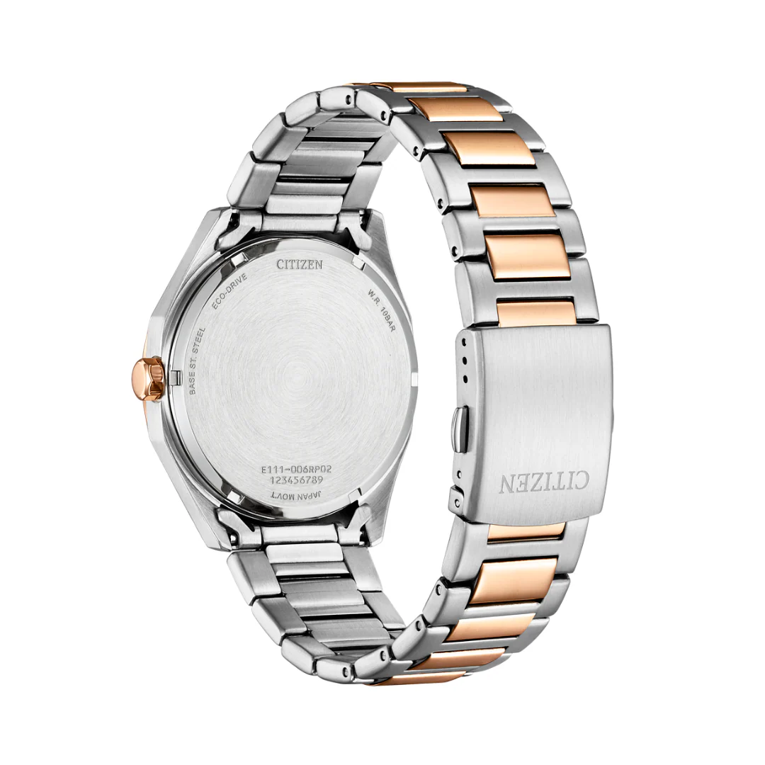 The Citizen BM7606-84L Eco-Drive Two-Tone Stainless Steel Men Watch blends modern elegance with everyday reliability. Designed with a 41mm stainless steel case and bracelet accented in rose gold two-tone, it features a striking blue dial with a practical date display. Powered by the Eco-Drive Calibre E111, this timepiece runs on any light source and offers up to 6 months of power on a full charge, removing the need for battery replacement. With mineral glass protection and 100-meter water resistance, it is both durable and stylish.
