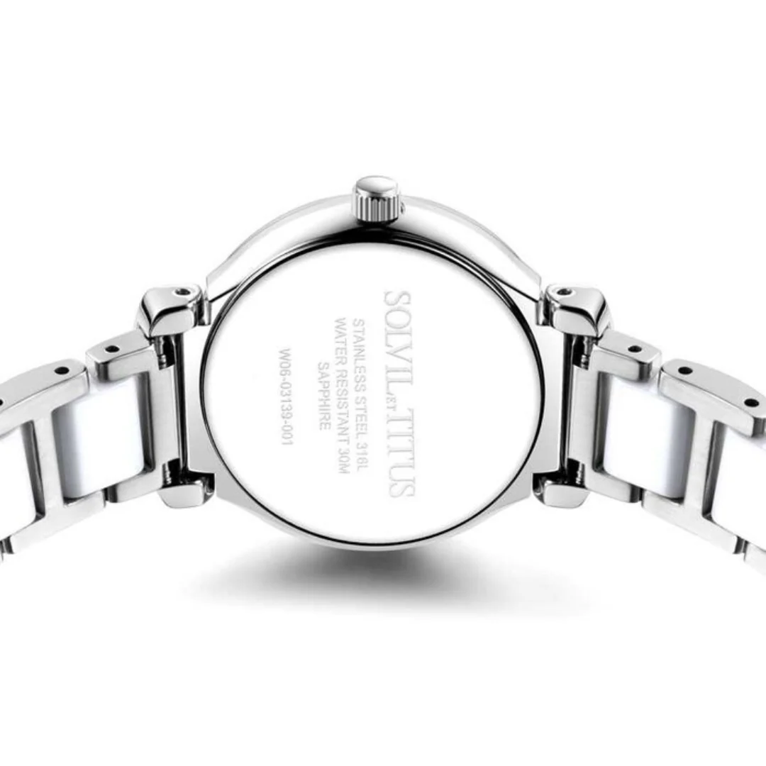 The Solvil et Titus Fair Lady W06-03139-001 elevates everyday sophistication with its distinctive silver ceramic bracelet paired with a luminous white mother of pearl dial. Combining Swiss heritage with contemporary materials, this timepiece offers refined femininity and enhanced durability in a beautifully proportioned 28mm case.