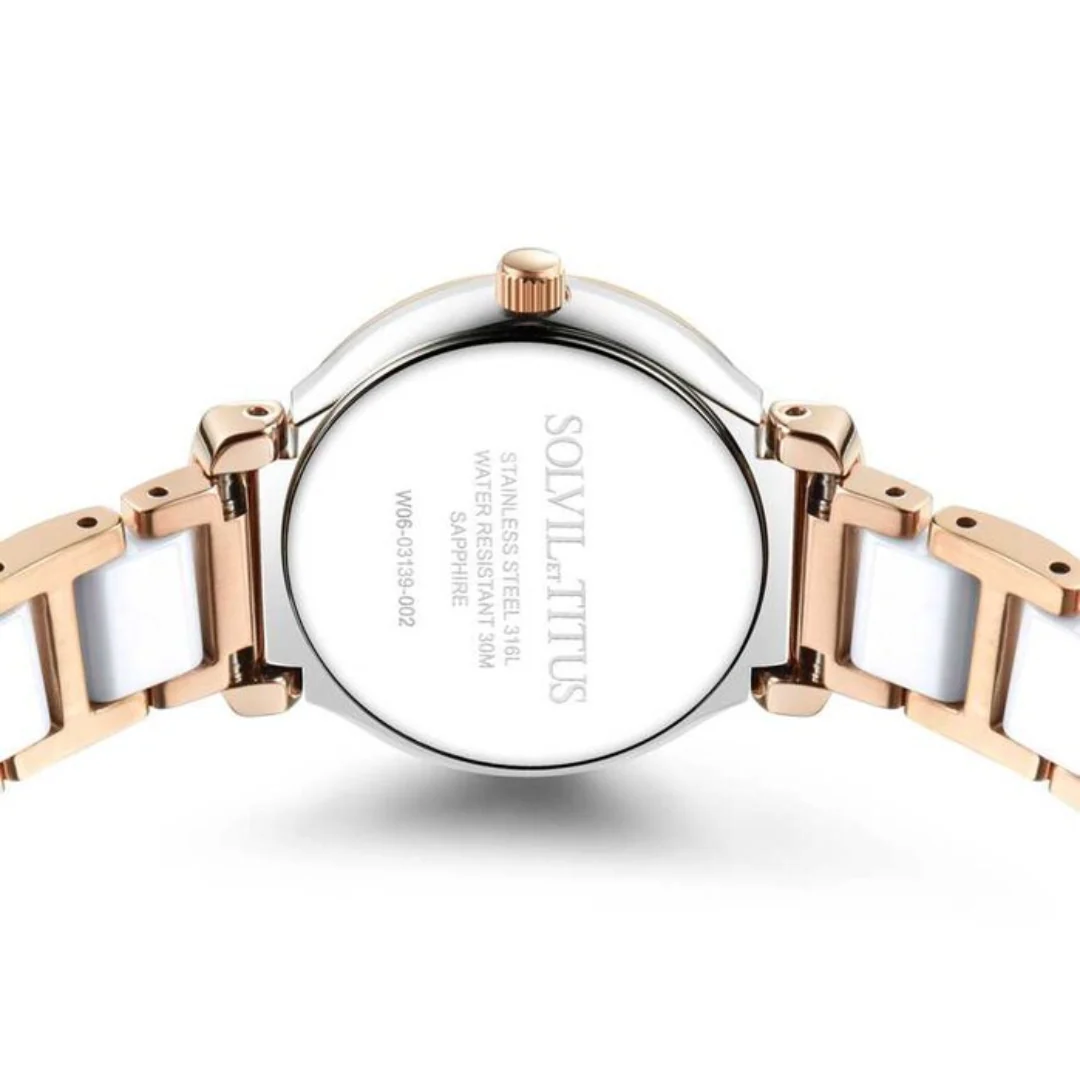 The Solvil et Titus Fair Lady W06-03139-002 elevates everyday sophistication with its distinctive ceramic and rose gold bracelet paired with a luminous white mother of pearl dial. Combining Swiss heritage with contemporary materials, this timepiece offers refined femininity and enhanced durability in a beautifully proportioned 28mm case.