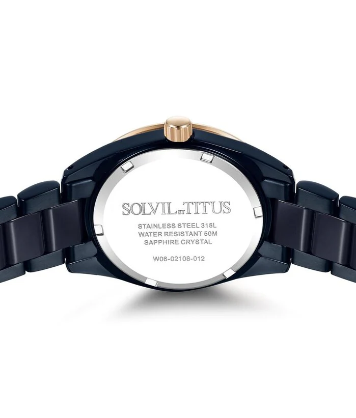 The Solvil et Titus Perse W06-02108-012 Multi-Function Quartz Women Watch offers refined elegance with a 35.5mm stainless steel case and a blue ceramic-accented bracelet. Its deep blue dial is complemented by multi-function sub-dials, adding both style and practicality. Featuring sapphire glass for clarity and scratch resistance, this quartz timepiece is water resistant up to 5 ATM, making it a versatile choice for modern women.